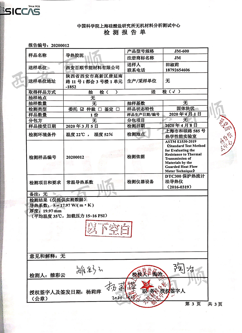 •        西安百順節(jié)能材料有限公司成立于1998年,二十五年來,我們專心、專注于導(dǎo)熱膠泥產(chǎn)品的研發(fā)、生產(chǎn);企業(yè)通過ISO9001:2015質(zhì)量管理體系認(rèn)證,制定了Q/BS 001-2020《無機(jī)型導(dǎo)熱膠泥》企業(yè)標(biāo)準(zhǔn),經(jīng)過不斷的研發(fā)、優(yōu)化,成功開發(fā)、生產(chǎn)、銷售了針對(duì)不同工藝、不同材質(zhì)、方便施工的JM-250、JM-600、JM-800、JM-1000系列導(dǎo)熱膠泥,年生產(chǎn)能力2000噸;